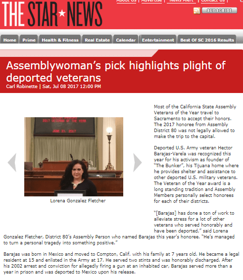 Deported U.S. Army veteran Hector Barajas-Varela was recognized this year for his activism as founder of “The Bunker”, his Tijuana home where he provides shelter and assistance to other deported U.S. military veterans. The Veteran of the Year award is a long standing tradition and Assembly Members personally select honorees for each of their districts.